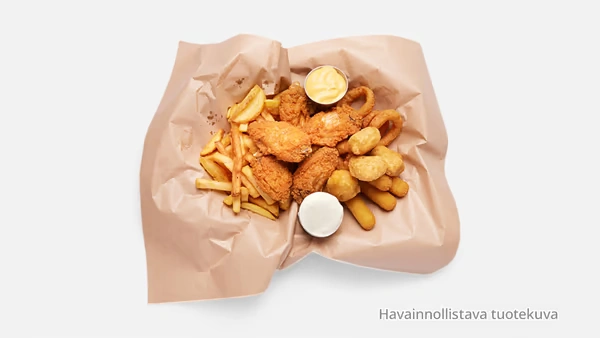 5 Kpl siipiä, 75g pihvi, 2 kpl sipulirenkaat, ranskalaiset, 5 kpl nugetit