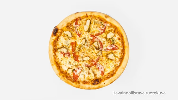 Pizzapohja, kana kebab, juusto, salaatti, tomaatti, suolakurkku